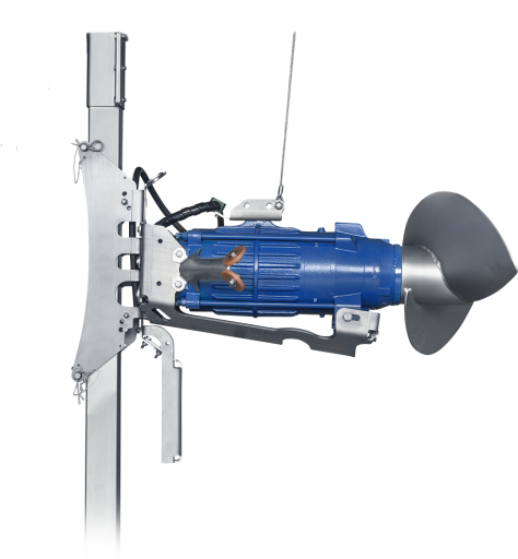 Eisele-Tauchmotorrührwerk der GTW-Serie mit 15kW. Mit Hilfe einer Seilwinde lässt sich das Rührwerk in der Höhe verstellen und kann somit auf der gewünschten Position betrieben werden. Eine reißfeste